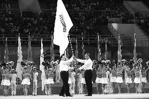 下一站,天津 閉幕式上,國家體育總局局長劉鵬(右)將中華人民共和國運(yùn)動(dòng)會(huì)會(huì)旗交給天津市市長黃興國。第十三屆全運(yùn)會(huì)將于2017年在天津舉行。新華社發(fā)