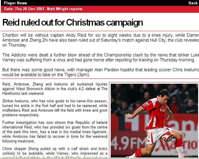 中新網(wǎng)12月21日 當(dāng)?shù)貢r間周四,查爾頓官方網(wǎng)站傳來壞消息,包括中國球員鄭智、隊長里德在內(nèi)的幾名主力球員因傷將缺陣本周六對陣赫爾城的比賽。