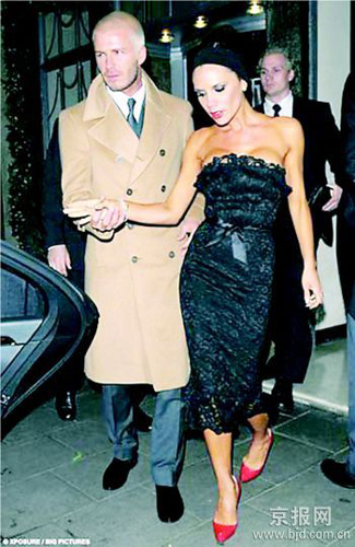 夫唱婦隨,維多利亞的穿著打扮也同樣的老氣橫生。當(dāng)晚維多利亞穿了一件鑲嵌蕾絲邊的連衣裙,腰間別了個蝴蝶結(jié),頭發(fā)盤起,頭上戴著黑色頭箍,臉上的妝依舊畫得很濃,還穿了雙紅色高跟鞋。不知道是擦得粉太重,還是新年活動過于忙碌而體力透支,鎂光燈下的“辣妹”一臉慘白形像老態(tài)。英媒體諷刺這身打扮超出了她33歲的年齡,看起來簡直可與丑劇大師馬塞歐比肩。(記者劉大偉)