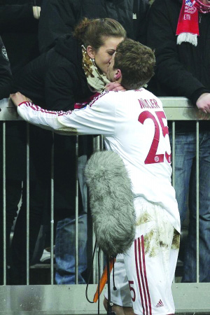 這位在租借而來的前鋒多諾萬回到美國大聯(lián)盟之后才得到出場機會的小將,在昨晨比賽的第72分鐘登場,這也是他在歐冠聯(lián)賽中的處子秀,然而17分鐘過后,他就在一次角球混戰(zhàn)中攻入了個人的歐冠聯(lián)賽處子球。進(jìn)球后的穆勒顯得非常興奮,飛奔到看臺上女友所在的位置,而他的女友很默契地送上了浪漫一吻。看到這對恩愛的小情侶,現(xiàn)場所有觀眾都送出了自己的掌聲。