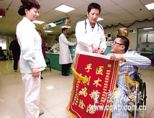 昨天,田曉偉特意將一面錦旗送給了主治醫(yī)生帥杰,以此方式對(duì)這位“球迷朋友”表達(dá)特別謝意。