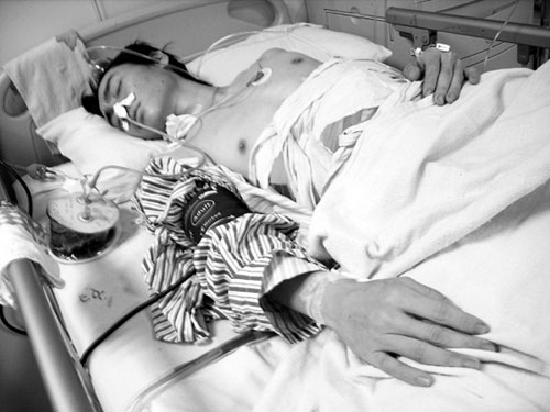12月9日上午,記者在中國醫(yī)科大學(xué)附屬第一醫(yī)院重癥監(jiān)護室,看到身受重傷的王某仍躺在病床上接受著治療。據(jù)王某的母親介紹,王某今年22歲,原是遼寧某足球隊一名球員。今年年初時,因為家中經(jīng)濟條件不是太好,再加上外面還有許多債務(wù),無力供王某繼續(xù)踢球,王某被迫從球隊回到家中。眼下,家中正托人幫著孩子尋找工作,可工作沒有找著孩子便出了事。