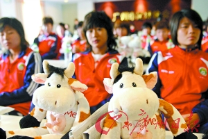 昨天是圣誕節(jié),正在廣州集訓(xùn)的中國女足首次亮相越秀山體育場。在參加由四國女足邀請賽冠名贊助商南方人才市場主辦的新聞發(fā)布會時(shí),球員們收獲了一份意外的“圣誕禮物”:身上印有“kiss me (親我)”英文字樣的奶牛公仔。贊助商這一別出心裁的禮物,讓包括韓端、畢妍在內(nèi)的女足姑娘們個(gè)個(gè)愛不釋手。