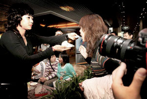 “粽子”們的舉動(dòng)讓韓端激動(dòng)得不知說什么才好。她拿起小刀切開蛋糕發(fā)給“粽子”和記者!皝,我們以蛋糕代酒,感謝你們對(duì)我的支持!”韓端說著給在場的人喂蛋糕。