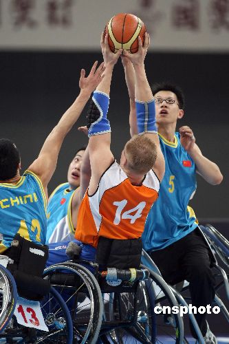 國(guó)際輪椅籃球邀請(qǐng)賽中國(guó)男隊(duì)無力阻擋荷蘭男隊(duì)進(jìn)攻。