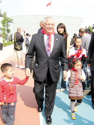 昨天下午,大衛(wèi)·斯特恩率領(lǐng)騎士眾星出現(xiàn)在上海閔行區(qū)的魯冰花農(nóng)民工小學(xué),NBA為這所學(xué)校捐建了一個籃球場、一個電腦室和一個圖書室,大衛(wèi)·斯特恩親自為這些康樂中心剪彩。在兩個小學(xué)生的牽引下,戴著紅領(lǐng)巾的大衛(wèi)·斯特恩滿面春風(fēng),看到孩子們早就坐在籃球場上等他到來,斯特恩高興地向孩子們揮手致意。