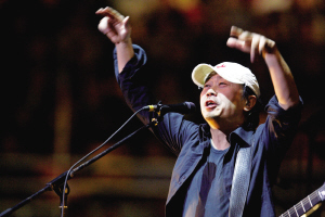 演唱會的曲目多以老歌為主,唱得歌迷情難自控。一不小心,就蓋過了老崔的聲音。《春節(jié)》《一塊紅布》《花房姑娘》《一無所有》,都是氣勢磅礴的大合唱。由于是四面臺,老崔在演出中肯定得背對著一邊的觀眾。為了公平,在演出進(jìn)行到三分之一時,趁著桑巴亞單獨(dú)演出的機(jī)會,老崔和樂隊把樂器掉了個過兒,面向本來背對的觀眾。一些眼