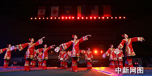 二00八年“全球通”女子摔跤世界杯在山西省城濱河體育中心舉行。山西藝術(shù)家熱情地為體育健將們帶來精彩歌舞,使賽場(chǎng)添加幾許短暫輕松。張?jiān)?攝