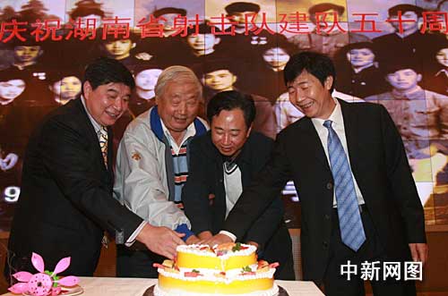 國家射擊射箭運動管理中心副主任、國家射擊隊總教練王義夫(左一)與湖南省體育局局長李舜(左三)等共同為湖南省射擊隊建隊50周年切慶典蛋糕。 作 者:劉雙雙