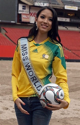 中新網(wǎng)11月21日電 當?shù)貢r間22日,2009年聯(lián)合會杯抽簽儀式將在南非城市約翰內(nèi)斯堡舉行。包括世界小姐張梓琳在內(nèi)的各國佳麗應邀前往,在約翰內(nèi)斯堡的埃利斯球場大秀球技。