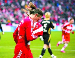 最先掀起“愛情風(fēng)暴”的是當(dāng)下狀態(tài)大勇的法國球星里貝里,他本場特意穿上粉紅球鞋戴上紅色手套,活脫脫一個(gè)紅色小精靈。第29分鐘他的任意球直接破門,為球隊(duì)很快扳平了比分。這也是里貝里連續(xù)第6場聯(lián)賽進(jìn)球,激動(dòng)的他在進(jìn)球后特別親吻了寫有妻子瓦希芭(Wahiba)名字的左手腕繃帶。半場結(jié)束前,中衛(wèi)德米凱利斯收獲進(jìn)球。阿根廷人進(jìn)球后令人意外地?fù)炱鹎驅(qū)⑺M(jìn)球衣里,做出孕婦的姿勢。原來這一幕是獻(xiàn)給他已經(jīng)懷孕的女友伊萬格利娜的。下半場,拜仁的進(jìn)球風(fēng)暴并未停歇,而表達(dá)愛意的慶祝動(dòng)作也似乎可以傳染?寺鍧蓪⒗镓惱锏膫髦星蝽斎牒,伸出三根手指,指代妻子希爾維婭和雙胞胎兒子。此后托尼和奧多配合后破門,意大利人也特別親吻著左手,原來大拇指上戴有未婚妻瑪塔送他的戒指。