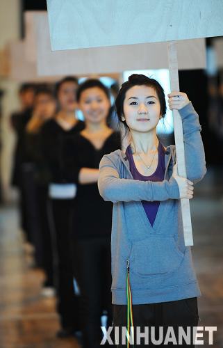 11日12時40分,70個女孩來到現(xiàn)場后,持牌手的總教練汪燕引導女孩們進行走位,讓女孩熟悉開幕式當天的入場順序,這是進入場館訓練的第三天。汪燕是黑龍江職業(yè)技術(shù)學校的校長,據(jù)她介紹,這70個女孩都是大冬會禮儀小姐,其中有44個女孩是倍受矚目的持牌手。
