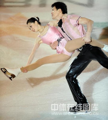 2009年2月25日,為答謝觀眾,獲得第24屆世界大學(xué)生冬季運(yùn)動會花樣滑比賽前三名的選手,在哈爾濱國際會展中心體育館進(jìn)行表演。圖為獲得雙人滑冠軍的中國選手張丹/張昊激情演出。(中體在線圖片 白宇 攝)