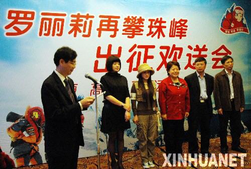 3月26日,羅麗莉(左三)在出征儀式上。當(dāng)日,27歲的廣西女孩羅麗莉第二次登珠峰出征歡送會在廣西南寧舉行。羅麗莉從2002年到2007年,五次攀登了三座8000米以上的山峰,還曾創(chuàng)造了兩年連登三大高峰的奇跡。2006年羅麗莉曾嘗試登頂珠峰,但由于氧氣面罩漏氣等原因在登到海拔86