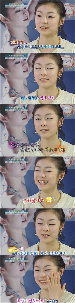 中新網(wǎng)4月30日電 據(jù)韓國(guó)《中央日?qǐng)?bào)》報(bào)道,“花滑天后”金妍兒昨日做客MBC電視臺(tái),講述了頒獎(jiǎng)典禮的一些片段。她說(shuō):“聽到國(guó)歌響起眼淚就止不住,我又擔(dān)心哭的樣子不好看,會(huì)把妝弄花,費(fèi)了很大力氣想忍住,但眼淚還是自然地流下來(lái)了!