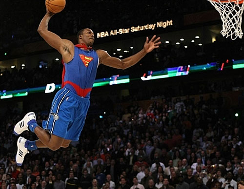 中新網(wǎng)2月18日電 2008年NBA全明星賽扣籃大賽北京時(shí)間2月17日上午舉行,魔術(shù)隊(duì)中鋒德懷特-霍華德的扣籃創(chuàng)意獨(dú)特,征服現(xiàn)場(chǎng)評(píng)委和賽場(chǎng)內(nèi)外球迷。其中扮演“超人”的一扣更是技驚四座。最終他以高達(dá)78%的球迷支持率成功當(dāng)選今年的“扣籃王”。