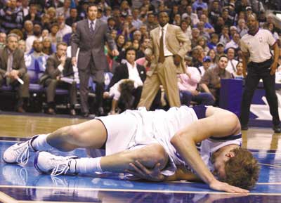 諾維茨基是在昨天比賽第三節(jié)還剩下3分25秒時(shí)受傷的,當(dāng)時(shí)他在拼搶中左腳踝與膝蓋受傷,諾天王最少需要休養(yǎng)兩周,這意味小牛隊(duì)的季后賽資格將受到影響。