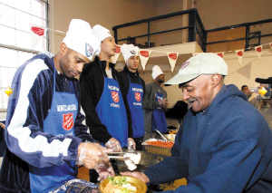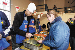 昨天,易建聯(lián)(左圖左一)和卡特、哈里斯等籃網(wǎng)隊(duì)員一起來到新澤西的一家教堂,在感恩節(jié)到來之際,向當(dāng)?shù)厣鐓^(qū)貧困居民分發(fā)食品。在活動(dòng)現(xiàn)場(chǎng),易建聯(lián)身著便裝頭戴一頂繡有籃網(wǎng)標(biāo)志的廚師帽發(fā)放食物,整個(gè)活動(dòng)過程中易建聯(lián)始終面帶微笑,并和獲贈(zèng)食物的居民親切交談。