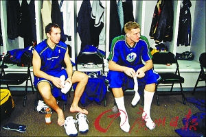 反正在賽前,你絕對見不到更衣室里人員扎堆的情況。賽場上練完投籃的人,還會跑到更衣室練點別的;在更衣室里按摩的人,弄完之后也會跑到賽場上再練會。而且,大家練習(xí)的時間也不一樣。有的人練得早,有的人出來得晚,在這樣的情況下,你要看到球員聊天說話,實在不是一件容易的事情。一般也就一兩個球員碰到一起,換衣服的時候、吃東西的時候,才會相互聊上兩句。要想在賽前采訪球員,除了等待,還得看運氣。