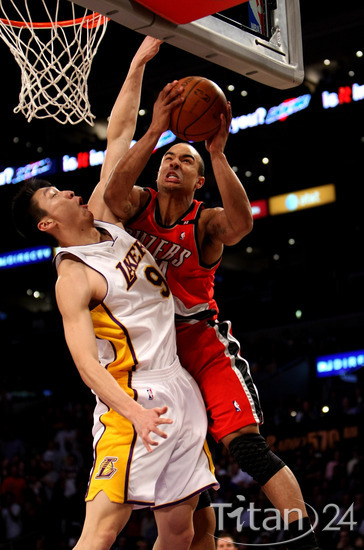 拉德馬諾維奇投籃不中,開拓者發(fā)動(dòng)快攻。孫悅積極回防,試圖跳起封蓋貝勒斯的反擊。不過這位今年11號(hào)秀在孫悅面前表演了一個(gè)拉桿上籃,躲過了他的防守,造成了孫悅的犯規(guī)。