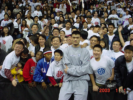 然而,令現(xiàn)場觀看比賽的華人球迷更為激動的是,比賽結(jié)束后,姚明在火箭隊(duì)新聞官尼爾森-路易斯的陪同下,來到了他們中間。在休斯頓姚明球迷俱樂部十幾位理事的精心組織下,姚明帶著勝利后的微笑,分四次先后與耐心坐等在觀眾席上的數(shù)千名球迷合影。這一歷史性場景后來多次被全球的體育報刊雜志登載出來。