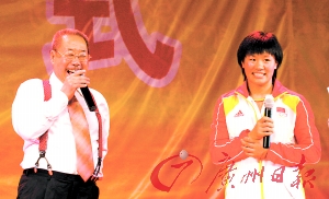 何賽飛的話顯然啟發(fā)了楊秀麗,在記者的“慫恿”下,她向協(xié)辦此次畫展的中體明星隊(duì)領(lǐng)隊(duì)王奇說了自己的想法。王奇立即將楊秀麗送上了臺(tái)并和主持活動(dòng)的崔永元偷偷交代!岸祭蠋,您請(qǐng)留步!贝抻涝獙l(fā)言完畢的都本基留在臺(tái)上,“奧運(yùn)冠軍楊秀麗希望能拜您為師學(xué)習(xí)書法!边@是個(gè)意外安排,都本基大師顯得非常激動(dòng)!斑@個(gè)徒弟我收下了!”老人的干脆讓楊秀麗有些驚訝,她深深地向老師鞠了一躬,頭上的汗水晶瑩可見!拔业膵屟剑o張死了,從沒這么緊張過!苯K于如愿的楊秀麗抹了一把汗說,“這下我回去更要好好練字了!