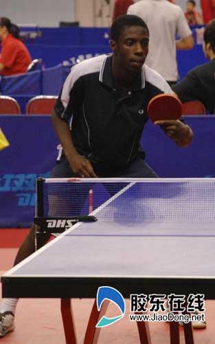 地球人都知道,世界高水平的乒乓球運(yùn)動(dòng)員都集中在東亞和歐洲,乒乓球幾乎與黑人運(yùn)動(dòng)員絕緣。據(jù)說(shuō),這是因?yàn)楹谌说募∪忸愋秃蜕窠?jīng)類型不適應(yīng)這項(xiàng)運(yùn)動(dòng)。不過今天上午記者在比賽現(xiàn)場(chǎng)看到了一位地道的黑人選手正與中國(guó)運(yùn)動(dòng)員對(duì)練,而且水平不低,打得有聲有色,稀奇,稀奇。