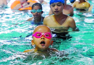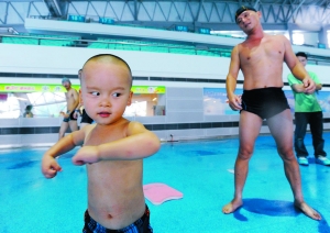 接下來(lái),小家伙就要表演20米蛙泳了。“腰往下,向前躍——”劉先生的口令剛喊出口,小劉暢胖嘟嘟的小腿一蹬地,已經(jīng)撲通一聲跳進(jìn)水池。很快,他的身體就浮出了水面,滿(mǎn)不在乎地向前游去,可愛(ài)的模樣立刻引來(lái)一陣掌聲。