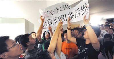 昨天上午11點,300余名國安球迷涌入國安足球俱樂部內(nèi)短短二三十米長的通道,他們高舉著“黃牛大哥,給我們留條活路”的標(biāo)語,情緒十分激動,抗議“黃!眽艛嚅T票,要求俱樂部保障球迷的利益。由于人數(shù)眾多,現(xiàn)場的暖氣片也被球迷擠壞,暖氣管道里的水灑了一地,廢棄的飲料瓶等雜物也隨處可見。陸續(xù)有數(shù)名民警趕到現(xiàn)場維持秩序,防止球迷出現(xiàn)過激行為。