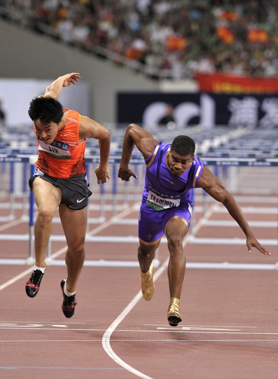發(fā)令槍響,或許是許久未上賽場的緣故,劉翔起跑稍顯猶豫,特拉梅爾沖到了前頭。但“飛人”很快找到狀態(tài),并充分利用自己后半程的加速能力,與特拉梅爾之間的距離也越來越小。在過第十個欄時,兩人已是齊頭并進,在全場觀眾的吶喊聲中,兩人同時撞線過關(guān)。最后經(jīng)由高速攝像機判定,查美爾有效部位先過終點。