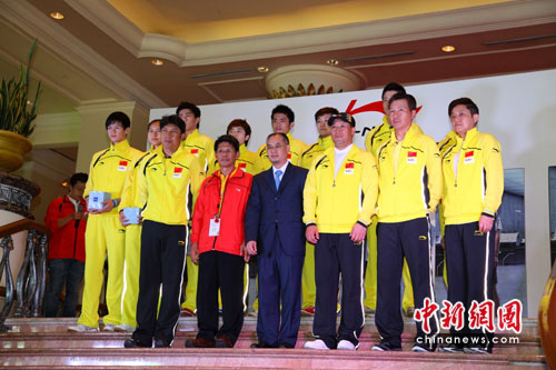 中新網(wǎng)5月9日電(記者 宗晨亮)2010年湯尤杯即將在5月9日-16日開打,國(guó)家羽毛球隊(duì)已抵達(dá)馬來(lái)西亞首都吉隆坡。大賽在即,近日國(guó)家羽毛球隊(duì)參加了“李寧-中國(guó)國(guó)家羽毛球隊(duì)誓師大會(huì)”,李寧到場(chǎng)與羽毛球隊(duì)總教練共同揭開了這次出征的新裝備,林丹、鮑春來(lái)等國(guó)家羽毛球隊(duì)主力隊(duì)員也身穿全新的比賽服裝集齊亮相,總教練李永波則代表國(guó)家羽毛球隊(duì)信心十足地表示“我們一定要在這次的湯尤杯上繼續(xù)取得佳績(jī),力爭(zhēng)衛(wèi)冕!