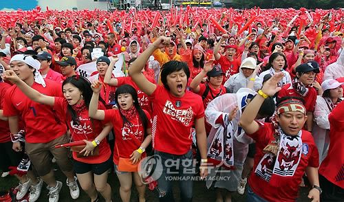 在韓國國內(nèi),熱情的韓國球迷也早早走上街頭,準(zhǔn)備為太極虎助威。警方稱,全國街頭助威地點(diǎn)共有280多處,預(yù)計(jì)會(huì)有178.6550萬名球迷為遠(yuǎn)征南非的太極虎助威。在首爾市,規(guī)模最大的助威場地要數(shù)首爾廣場,預(yù)計(jì)會(huì)云集25萬名球迷。盡管今天該國普降大雨,廣場卻已站滿了人,甚至有熱心球迷早上7點(diǎn)就來占位。