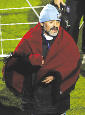 當(dāng)阿根廷隊(duì)剛剛結(jié)束訓(xùn)練,馬拉多納一行正要返回更衣室,這時(shí)兩個(gè)來自薩爾塔市(布宜諾斯艾利斯以北的小城)的阿根廷記者走了過來向老馬講述了他們長(zhǎng)途跋涉帶來禮物和祝福的故事,馬拉多納本來是快步走向更衣室的,聽到記者的故事立刻停了下來。“這是來自San Antonio de Los Cobres,一個(gè)海拔4000米小城孩子們的禮物,他們托我們?yōu)槟銕砹颂鹤。”聽到這里馬拉多納的真性情顯露無遺,接過毯子立刻披在了身上。這個(gè)被提到的小城叫做 San Antonio de los Cobres,距薩爾塔市約180公里,距布宜諾斯艾利斯約1750公里,海拔高達(dá)4000米,那里的球迷無法通過電視來觀看世界杯的比賽,但是他們一樣喜歡馬拉多納,關(guān)注阿根廷隊(duì)。許凱 黃啟元 本報(bào)南非專電