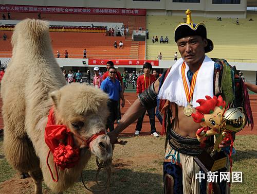 圖為身著傳統(tǒng)摔跤服裝的內蒙古選手巴雅爾巴特爾牽著獎品白駱駝走出賽場。