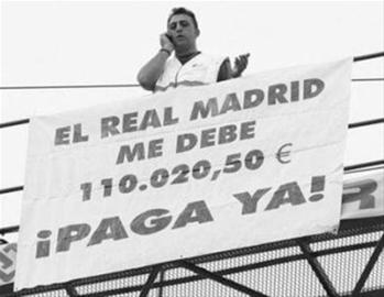 為了從皇馬俱樂部手中拿到這筆工程款,馬修鋁業(yè)公司老板卡洛斯·馬特奧不得不登上起重機上到高空,并貼出討債大字報,他希望通過這種方式引起全西班牙的關(guān)注,并逼迫皇馬盡早支付這筆款項。