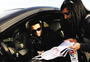 傷勢(shì)痊愈即將參賽,也令C羅心情大好。當(dāng)C羅在結(jié)束訓(xùn)練駕車(chē)離開(kāi)時(shí),受到了皇馬球迷的熱烈歡迎。球迷高舉著他的球衣,呼喊C羅的名字,而C羅也以禮相待,盡量滿足球迷的要求,簽名、合影留念,皇馬頭牌十分有親和力,更是在車(chē)?yán)锬托牡貫橐晃幻琅蛎院灻,并且滿足了其合影的要求。換了新發(fā)型,挑染了頭發(fā),帶著太陽(yáng)眼鏡,穿著閃亮的皮衣,似乎來(lái)到了馬德里,和這里眾多的造型達(dá)人朝夕相處,C羅的時(shí)尚觸覺(jué)也更加提升了。