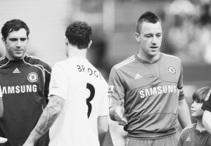 看臺(tái)上雙方球迷打出了支持各自球員的橫幅,與“特里之隊(duì)”相對(duì)的是“布里奇之隊(duì)”。開(kāi)場(chǎng)后,布里奇和特里有過(guò)一次直接面對(duì)面的機(jī)會(huì)。特里在大禁區(qū)左側(cè)拿球,布里奇在防守他,雙方并沒(méi)有糾纏太久,特里草草射了一腳門(mén)了事。