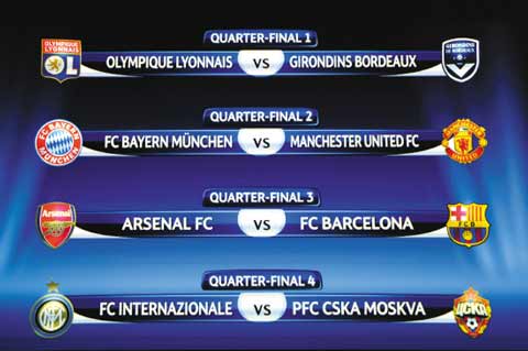 歐冠1/4決賽和半決賽對陣形勢昨晚在瑞士尼翁揭曉,上半?yún)^(qū)是拜仁慕尼黑對曼聯(lián)、里昂對波爾多,下半?yún)^(qū)是阿森納對巴塞羅那、國際米蘭對莫斯科中央陸軍,“重逢”成為本次抽簽的主題。由英超球隊包辦半決賽3個席位的乏味場面本賽季絕不會出現(xiàn)了,本賽季8強來自6個國家的聯(lián)賽。