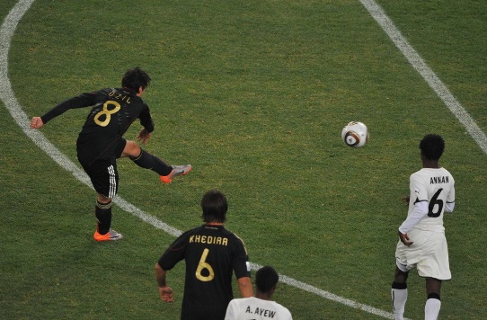 德國(guó)隊(duì)的控球時(shí)間高于對(duì)手,但是前鋒的把握機(jī)會(huì)能力差強(qiáng)人意。16分鐘,波多爾斯基抽射打空。加納隊(duì)的控球能力也很強(qiáng),隊(duì)員們技術(shù)比較出色,反擊十分犀利。第25分鐘,德國(guó)隊(duì)獲得了開(kāi)場(chǎng)以來(lái)最好的機(jī)會(huì),厄齊爾拿球后單刀直入,但是面對(duì)對(duì)方門將金森,竟然將球射到對(duì)方身上,皮球被擋出。加納隊(duì)隨后也發(fā)動(dòng)進(jìn)攻,阿尤角球開(kāi)到前點(diǎn),吉安高高躍起頭球攻門,門將撲救不及,但幸好門前的拉姆護(hù)門成功,在球門線上用身體將球擋出。