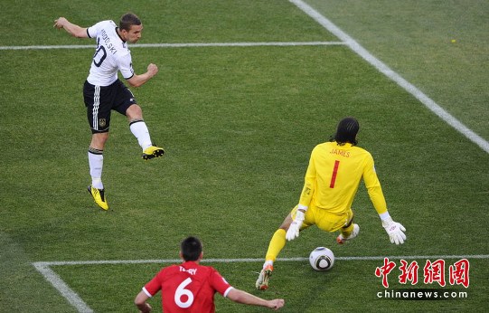 場上節(jié)奏開始加快,隨后格倫·約翰遜邊路傳中迪福的頭球打中橫梁,不過已經(jīng)越位在先。第32分鐘,德國隊卷土重來,打出漂亮的前場配合。穆勒接克洛澤挑傳突入禁區(qū),將球傳給了左邊路高速插上的波多爾斯基,后者小角度抽射打了詹姆斯一個穿襠,德國隊2-0領(lǐng)先。