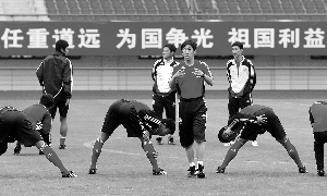 昨日上海驟然降溫,淅淅瀝瀝的小雨悄然而至,國家隊(duì)下午5時(shí)出現(xiàn)在訓(xùn)練場(chǎng)上,金山體育中心為國足打出“任重道遠(yuǎn)、為國爭(zhēng)光、祖國利益高于一切”的橫幅。主帥高洪波身穿紅衣短袖,而助理教練傅博、區(qū)楚良則身穿白底的運(yùn)動(dòng)外套,在國家隊(duì)隊(duì)員的包圍中,甚至很難辨別出少帥之身份。國安隊(duì)及山東隊(duì)的6名隊(duì)員由于航班原因遲到,因此首堂訓(xùn)練課由25名隊(duì)員參與。由于國足隊(duì)員上周末剛打完職業(yè)聯(lián)賽,因此首堂訓(xùn)練課主要以恢復(fù)性訓(xùn)練為主。訓(xùn)練內(nèi)容從慢跑開始,隊(duì)員們并沒有成群結(jié)隊(duì)一同跑,而是三三兩兩地分開慢跑,鄭智、王新欣與周海濱分成一組,慢跑中隊(duì)員不時(shí)聊天談笑,氣氛顯得十分輕松,絲毫不覺聯(lián)賽過后的疲憊。隨后在傅博的帶領(lǐng)下,隊(duì)員分成三組進(jìn)行搶圈訓(xùn)練,高洪波則在一旁當(dāng)“監(jiān)工”。在訓(xùn)練尾聲,以高洪波領(lǐng)銜的教練組與國足一同慢跑,此次慢跑持續(xù)了超過20分鐘。一個(gè)半小時(shí)的訓(xùn)練結(jié)束后,山東魯能的4名隊(duì)員韓鵬、王永珀、吳昊及劉金東才姍姍來遲,此時(shí)助教傅博氣喘噓噓地喊隊(duì)醫(yī)尹煜華說:“拿著表,盯著他們跑20分鐘啊。”尹大夫只好在雨中“獨(dú)訓(xùn)”國腳。