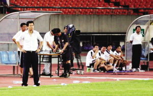 鬧劇的開始是上半場比賽第25分鐘,綠城隊(duì)長傳打申花身后,蔡楚川上演千里走單騎的好戲,揚(yáng)科從身后奮起直追,就在蔡楚川入禁區(qū)的剎那,揚(yáng)科閃現(xiàn)成功搶截。蔡楚川倒地,主裁判未予理睬——這讓現(xiàn)場的綠城球迷十分不滿,吼聲一片!然而此時(shí),申花替補(bǔ)席一陣騷動(dòng),賈秀全顯得極為激動(dòng),他在抗議:此球早已越位。主裁判趕到教練席邊,詢問邊裁剛剛的情況,賈秀全依舊不依不饒,他似乎對此前綠城外援喬爾丹的防守動(dòng)作非常不滿,認(rèn)為這應(yīng)該是一個(gè)明顯的犯規(guī)。主裁判在多次警告無效之后,只能向憤怒的賈秀全出示紅牌,賈秀全默默走向球員通道,手里拿著一部對講機(jī),只能遙控指揮比賽。