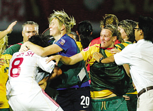 人在足球場,女子也瘋狂!8月3日晚上的武漢漢口體育場,在亞青賽中國隊(duì)與澳大利亞隊(duì)的比賽結(jié)束之后,溫文爾雅的女孩們也動起了老拳,場上三四十人亂戰(zhàn)成一團(tuán),經(jīng)過亞足聯(lián)官員長達(dá)十分鐘的調(diào)解,事態(tài)才暫時(shí)得到平息。然而,心懷不滿的澳大利亞女足姑娘們,還意猶未盡,在回到更衣室后,她們瘋狂地拆卸了更衣室的衣柜,砸成一團(tuán)。而她們的教練也按捺不住心中的憤懣,在發(fā)布會上當(dāng)著眾多記者面,砸掉了手中的礦泉水瓶,險(xiǎn)些砸到一名中國記者。一場普通的比賽,以這樣的方式收場,看來,足球之亂,并非只在中國球員身上,也并非只是成年隊(duì)球員。