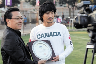 昨天下午,在大連隊(duì)訓(xùn)練時,來自韓國的KSB電視臺采訪組,一直在場邊拍攝安貞煥的訓(xùn)練畫面。訓(xùn)練結(jié)束后,他們邀請安貞煥做了一個訪談節(jié)目,介紹安貞煥在大連的足球生活。韓國鐵道部旗下的一家鐵路建筑公司,邀請安貞煥擔(dān)任他們的形象大使,采訪組代表在訓(xùn)練場邊向安貞煥贈送了“形象大使”的紀(jì)念獎杯。