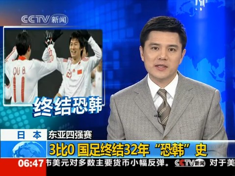 央視新聞以《3比0 國足終結(jié)32年“恐韓”史》為題,詳細的描述了三粒進球的過程。在這段長達1分多鐘新聞中,還配有國足比賽的實況錄像和現(xiàn)場圖片。最后,新聞還簡要回顧了國足32年“恐韓癥”的歷史,并評論昨天的比賽,是以“一場完勝終結(jié)了32年的恐韓癥歷史”。