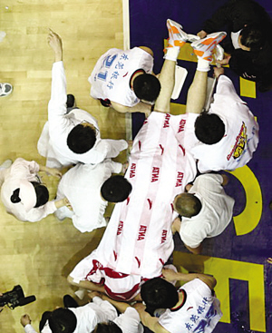此時場邊突然沖出一名穿著黑色衣服的人員,憤怒地一拳打向查爾斯。但此人很快就被死死抱住,新疆隊的球員也圍了過來,和廣東球員互有推搡,被抱住的查爾斯怒氣未消,想找杜鋒和那位想襲擊他的人予以還擊。裁判分開雙方球員,場上砸下許多雜物,更有侮辱性的語言贈與查爾斯。在槍林彈雨中,查爾斯被新疆隊的球員和部分警衛(wèi)簇?fù)碇x開球場。球場十分混亂。