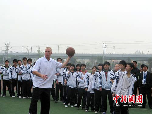 16日,NBA傳奇明星克里斯·穆林及NBA發(fā)展聯(lián)盟球員、北京奧神隊部分球員來到都江堰青城山高級中學(xué),與320名該;@球運動員一起進(jìn)行籃球訓(xùn)練活動。雖然語言不通,學(xué)生們?nèi)栽诖笄蛐堑膸ьI(lǐng)下傳球、運球、上籃,過足了一把NBA打球的癮。