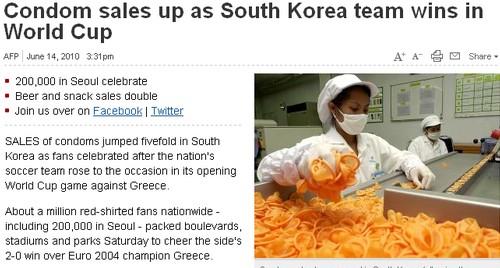 中新網(wǎng)6月15日電 在12日南非世界杯B組首輪小組賽中,韓國2比0擊敗希臘,而這場比賽的慶祝熱潮一直延續(xù)到了三天之后。據(jù)韓國媒體報道,韓國國內(nèi)避孕套的銷量大漲了將近五倍。