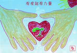 上周日,隊醫(yī)克蘭頓打電話告訴姚明傷情時,后者正在忙著作畫。缺席季后賽的消息并沒有影響到姚明的畫作。在這幅題為“有愛就有力量”的蠟筆畫中,兩只大手呵護(hù)著一顆紅色的愛心,里面有新芽生出。