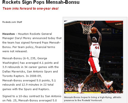 中新網(wǎng)9月4日電 北京時(shí)間今日,火箭官方宣布簽下英國內(nèi)線波普-門薩邦蘇,他的非保障性合同為期一年。門薩邦蘇目前不能確定在火箭打完整個(gè)2009-10賽季。